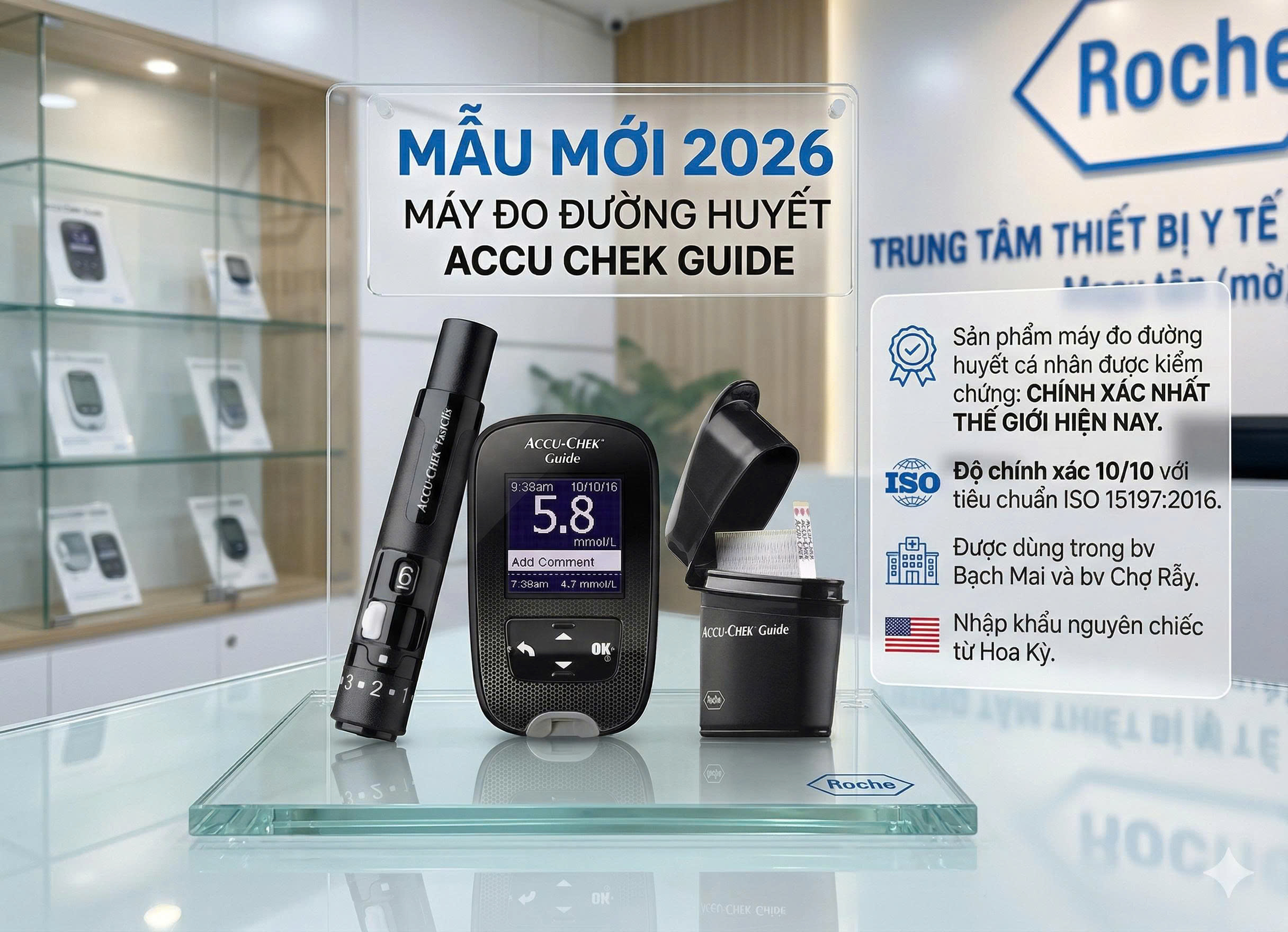 - Máy đo có độ chính xác đạt tiêu chuẩn ISO 15197:2016 đạt kết quả 10/10, theo báo cáo đánh giá hệ thống Accu-Chek Guide 2026